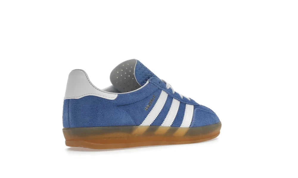 Das Obermaterial des Hallenschuhs adidas Gazelle blau Gummi für Damen besteht aus hochwertigem Veloursleder in der Farbe Blau. Das Modell für Damen ist hier in der Colorway Blau/Weiß/Goldmetallic erhältlich.