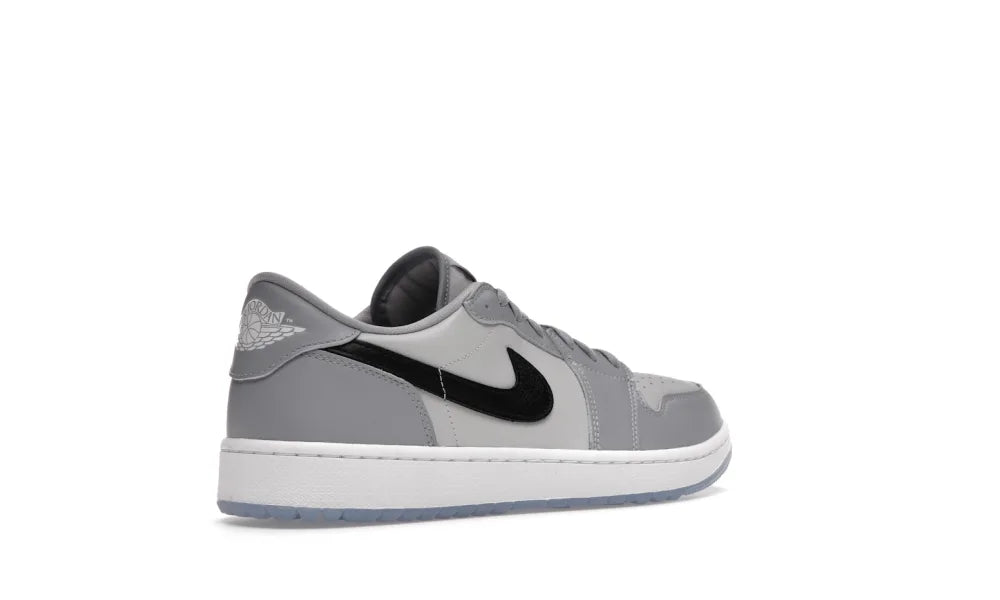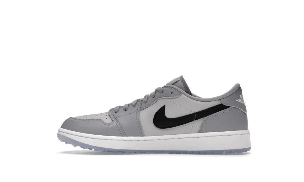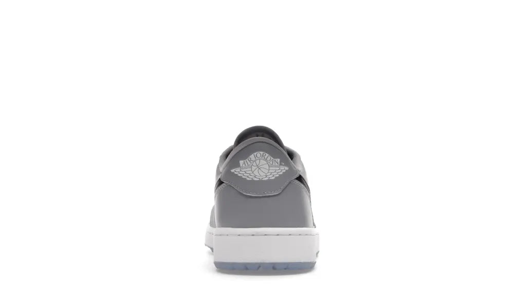 Der Jordan 1 Low Golf Wolf Grey ist ein klassisches Jordan 1-Modell für die Fairways. Das Obermaterial besteht aus grauem Leder mit schwarzen Swooshes und weißem Jordan Wings-Branding auf der Fersenlasche. An der Unterseite sorgt eine eisfarbene, durchscheinende Außensohle mit Rillen für Traktion und Stabilität.