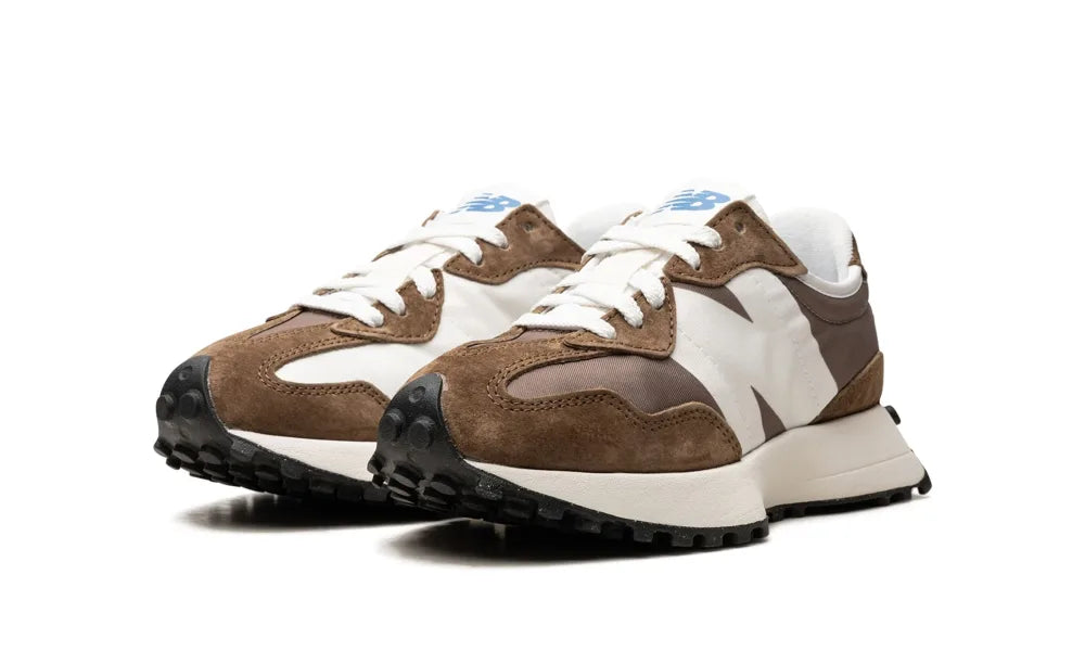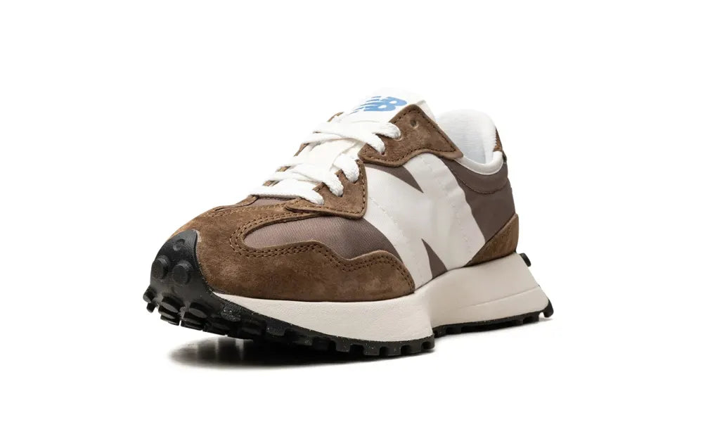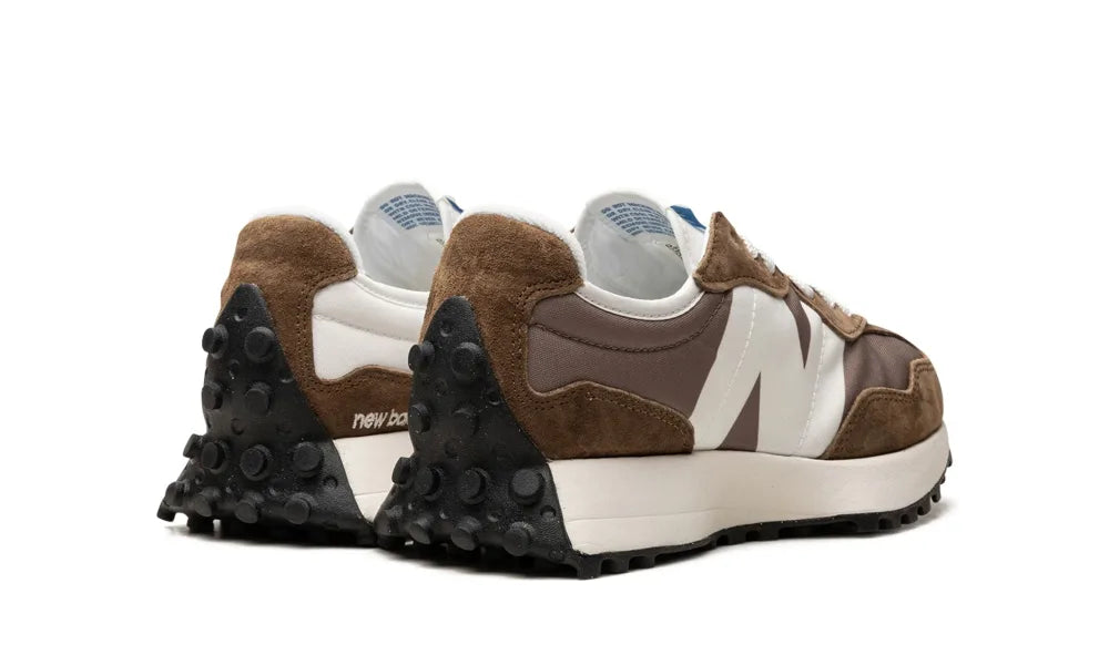 Der New Balance 327 Erdbraun und Pilzbraun präsentiert sich in einer erdigen Farbkombination aus verschiedenen Brauntönen. Dieser Sneaker besticht durch ein niedrig geschnittenes Design mit minimaler Polsterung am Kragen und einer flachen Zunge.
