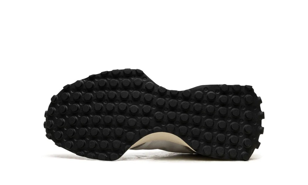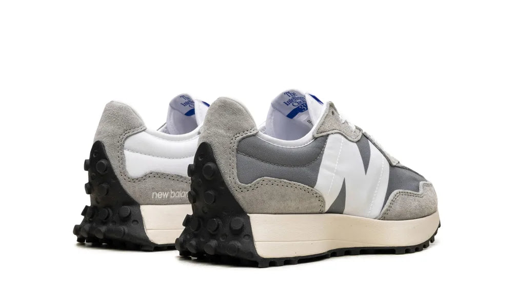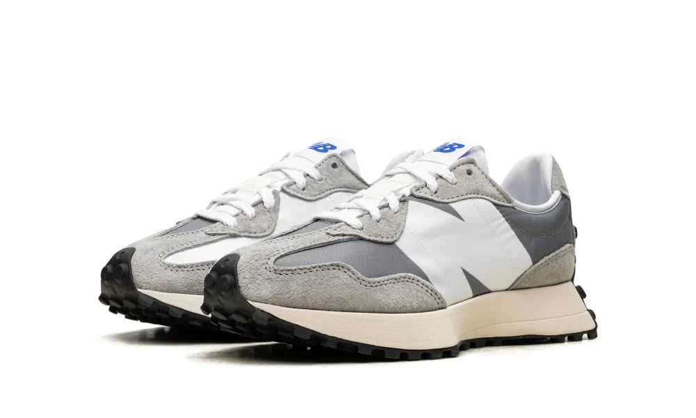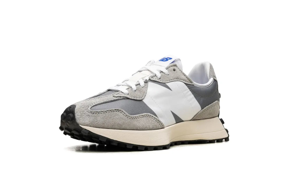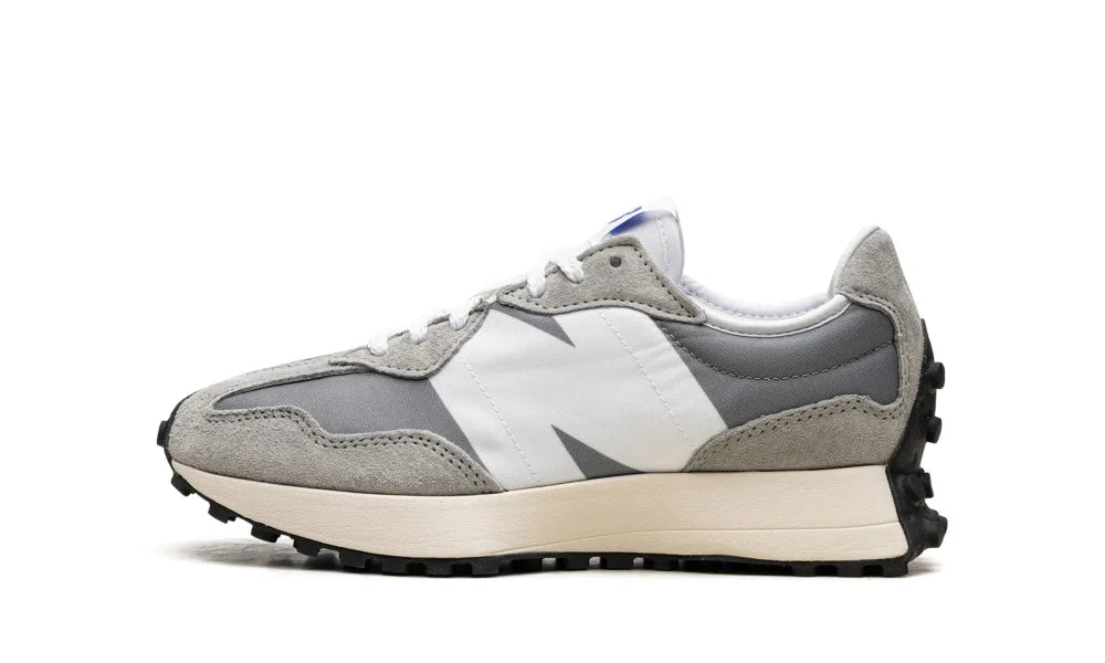 Der New Balance 327 Grey zeichnet sich durch ein grau-weißes Obermaterial aus Veloursleder und Nylon aus, wobei das schlichte Weiß als Farbgrundlage für die dicke Zwischensohle, das Futter und den Besatz am Kragen dient. Ein tiefes, weiches Grau bedeckt die Basis, umwickelt mit Overlays aus Veloursleder und einem hellen weißen New Balance Logo