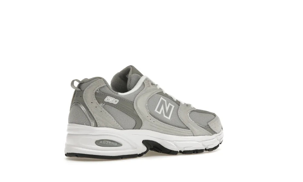 Die Colorway Regenwolkengrau, Grau und Weiß ist vom Farbton einer Regenwolke kurz vor dem Regenguss inspiriert und ähnelt dem Farbschema mehrerer New Balance 990-Sneaker. Das Obermaterial des Sneakers besteht aus atmungsaktivem Mesh mit weichen Overlays aus Veloursleder in ergänzendem Grau. Das New Balance „N" ziert das Seitenteil, während die „530" neben dem Fersen-Overlay zu finden ist. Die klobige ABZORB-Zwischensohle verleiht dem Sneaker einen 90er-Jahre-Look und dämpft Stöße. Die Gummilaufsohle sorgt für gute Bodenhaftung, ohne die Flexibilität zu beeinträchtigen. Der Sneaker „Regenwolkengrau" hat zudem eine gepolsterte Zunge und einen gepolsterten Kragen, wodurch er sich besonders bequem anfühlt.