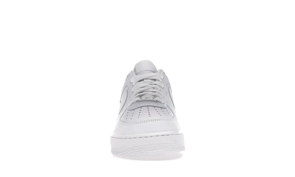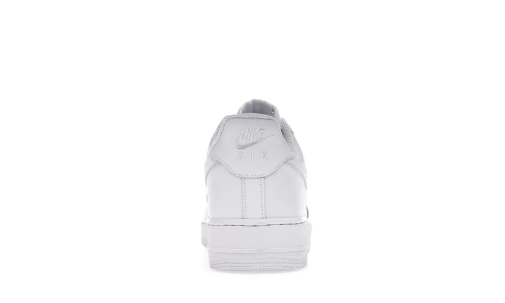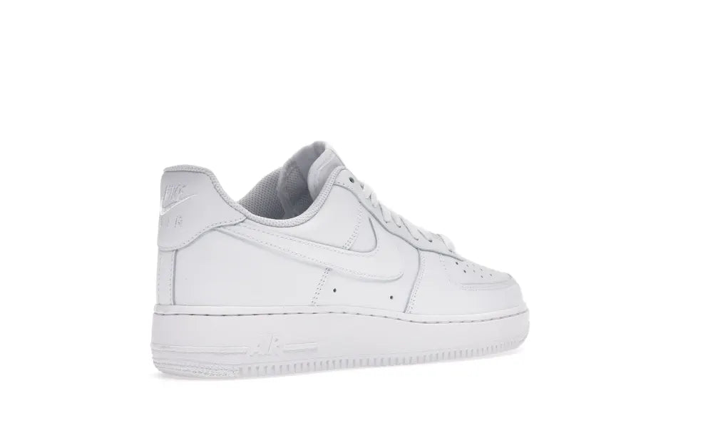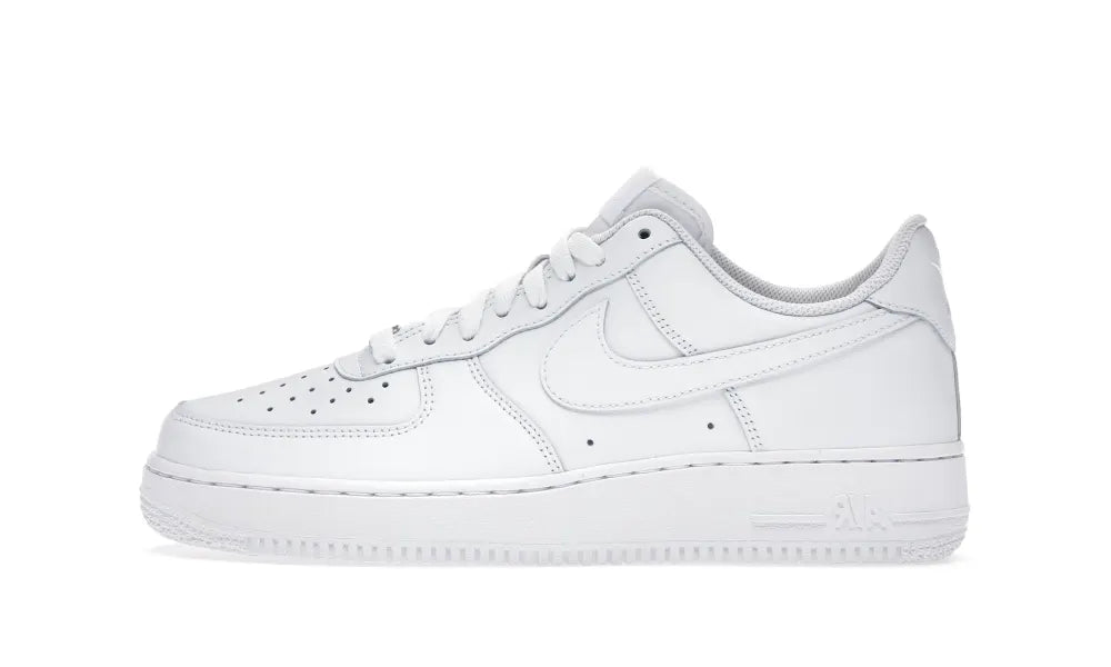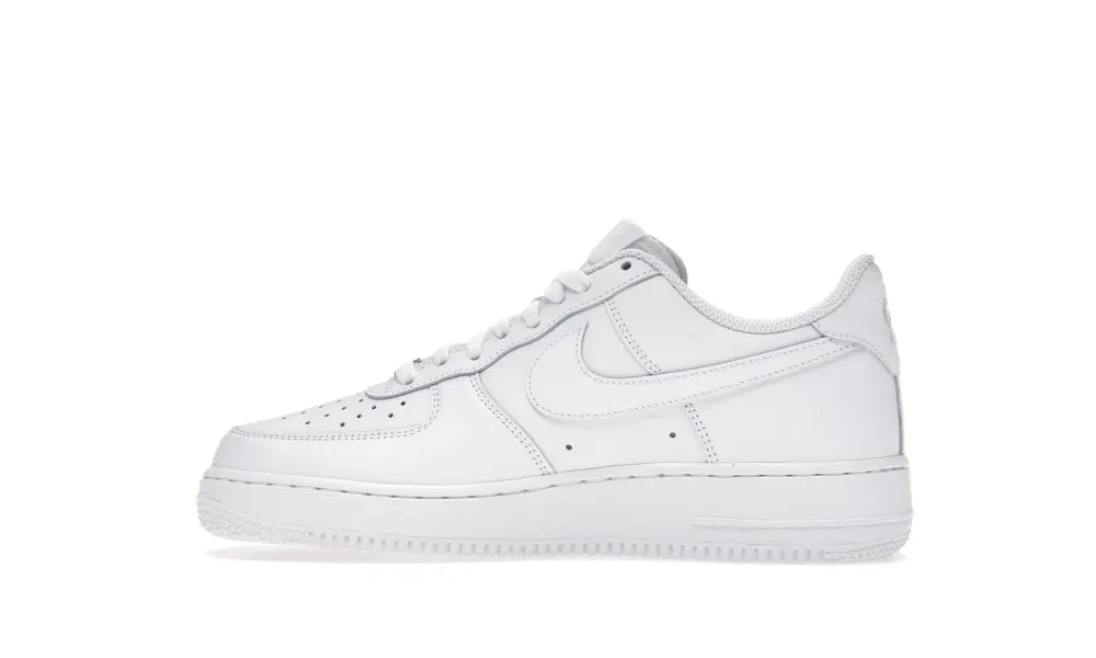 Der Nike Air Force 1 niedrig '07 weiß verfügt über ein komplett weißes Leder-Obermaterial mit einem perforierten Zehenbereich und Swoosh-Overlays. Eine Nike-Stickerei auf der Ferse und eine weiße Sohle runden das Design ab.