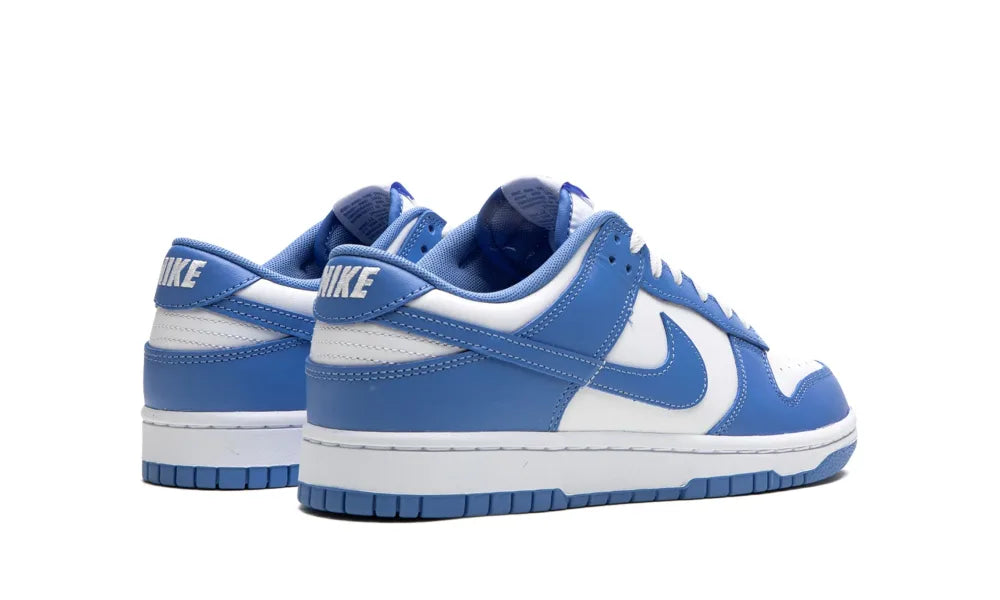 Das Obermaterial dieser Version des Nike Dunk niedrig besteht aus Leder. Unten hat der Sneaker eine weiße Gummiaußensohle. Polarblaue Überzüge befinden sich an der perforierten Zehenpartie, der Ferse, den Schnürsenkeln und über der Zwischensohle. Auch der Nike-Swoosh ist in Polarblau gehalten. Die Zunge ist für mehr Komfort gepolstert. An der Ferse ist das weiße Nike-Logo zu sehen.