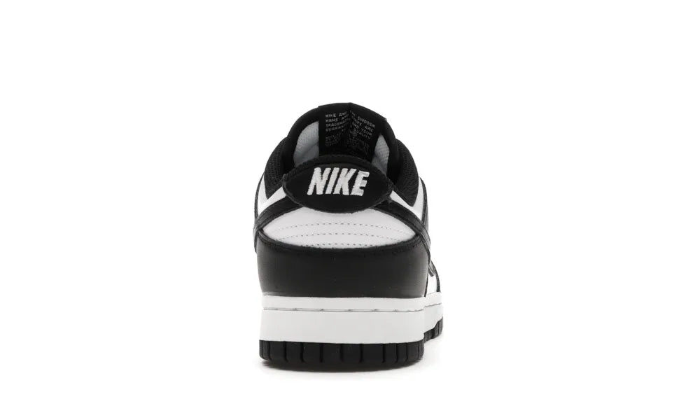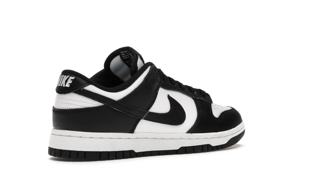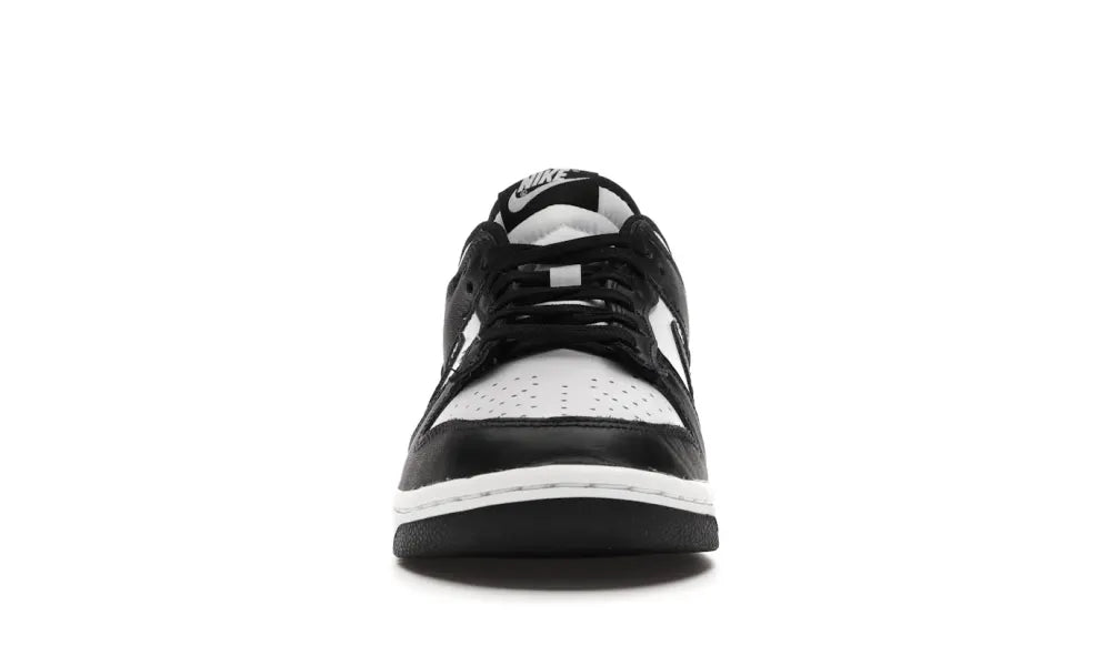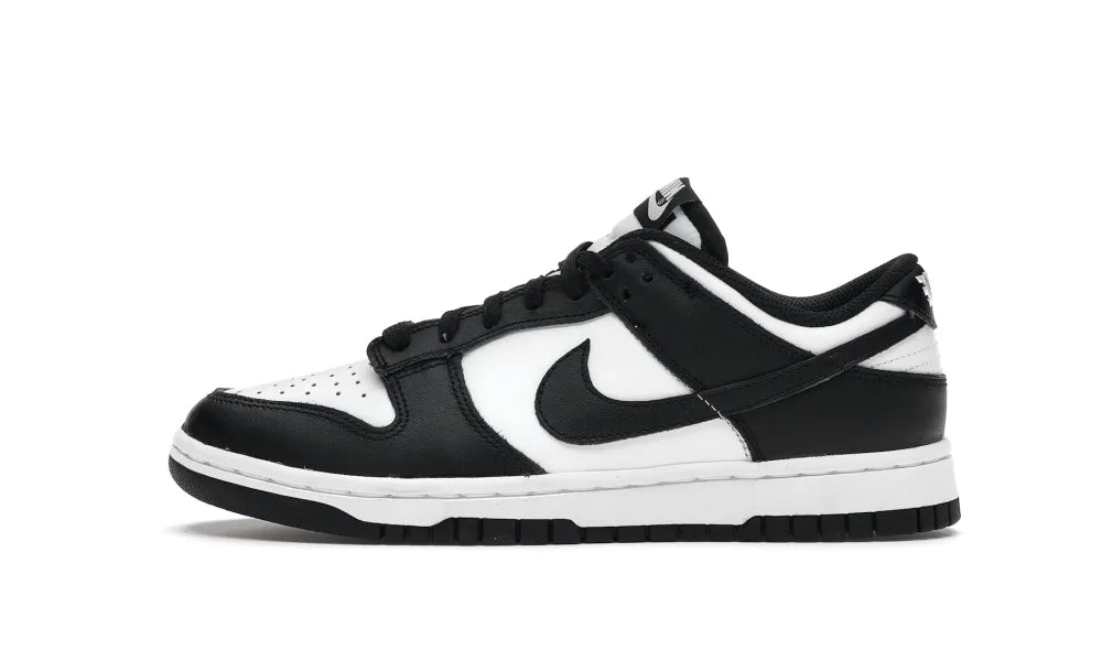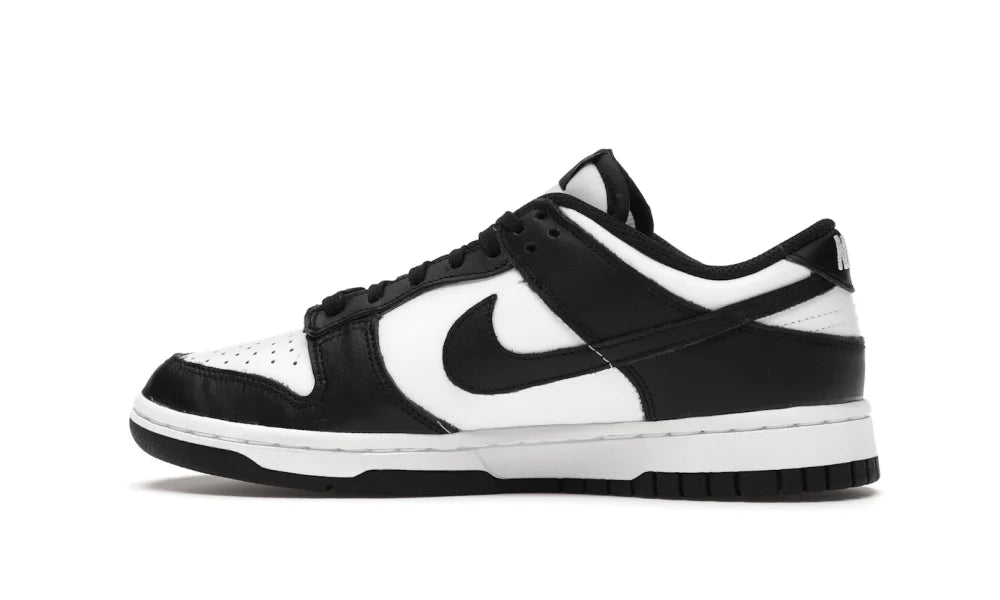 Der Nike Dunk niedrig weiß schwarz (2021) (Damen) ist aus weißem und schwarzem Leder gefertigt, das im Zehenbereich perforiert ist. Die Basis besteht aus weißem Leder, auf dem schwarze Überzüge in einem regelmäßigen Muster angeordnet sind. Die Seiten ziert jeweils ein schwarzer Nike-Swoosh, der sich um den Knöchel zieht.