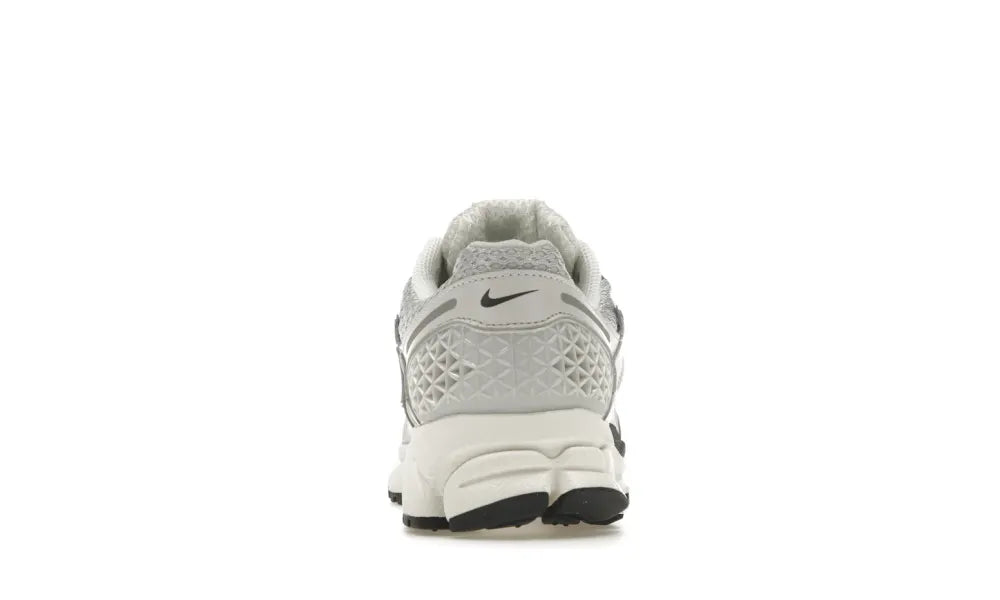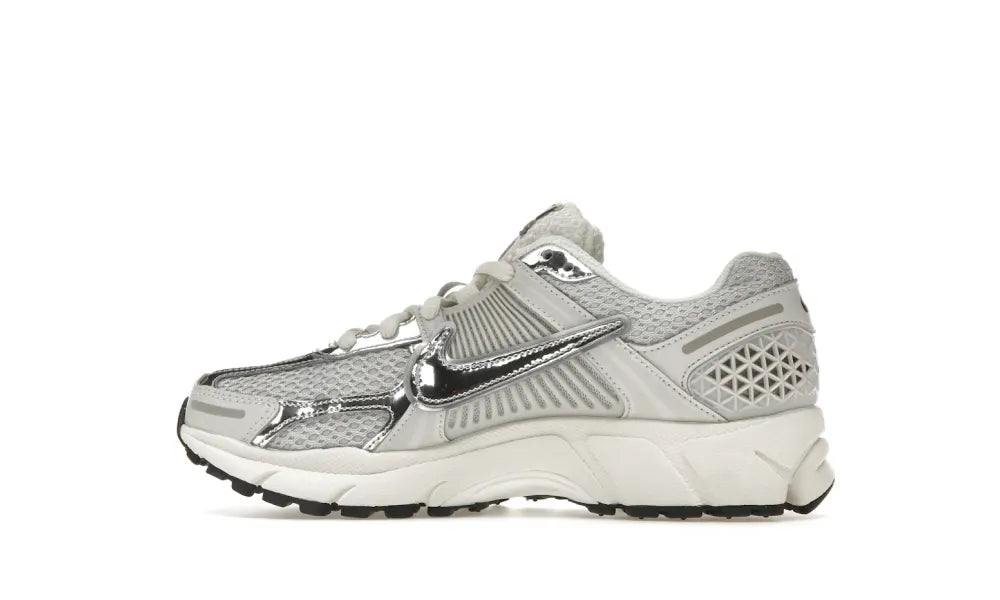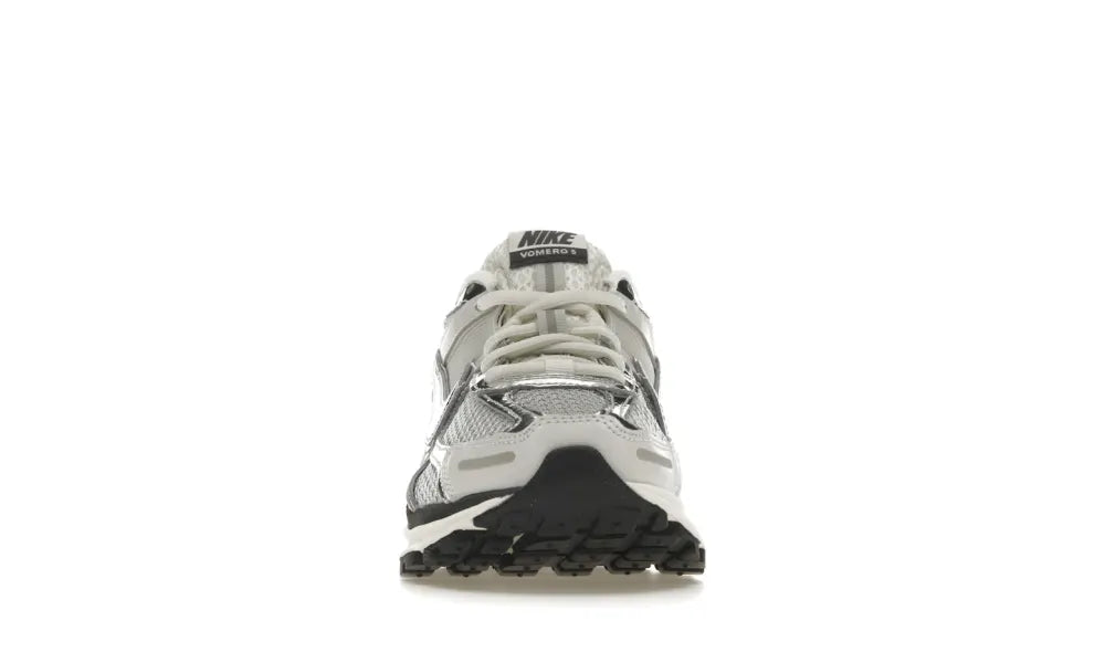 Die Farbpalette des Nike Zoom Vomero 5 hellgrau silbermetallic (W) reicht von Hellgrau über Chrom und Dunkelgrau bis zu Segelweiß.